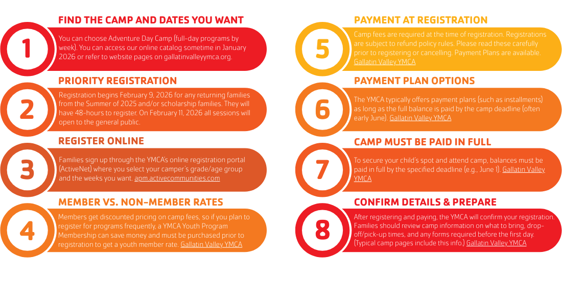 Summer camp registration at the Gallatin Valley YMCA is easy and done online. Families select their camper’s grade level and desired camp weeks, then complete registration and payment through the YMCA’s portal. Member discounts, payment plans, and scholarship options are available, and spots are filled on a first-come, first-served basis.